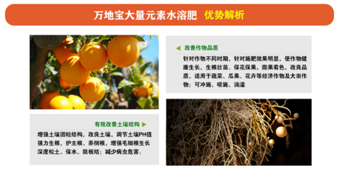 萬地寶大量元素水溶肥料采用磷酸二氫鉀或礦源黃腐酸鉀為原料,特別添加海藻酸與螯合微量元素,根據(jù)作物生長階段所需營養(yǎng)設計配方,適合多種施肥方式,省時省力。